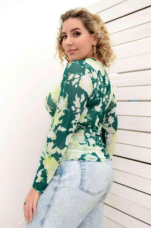 Plus Size Printed Round Neck Long Sleeve Blouse