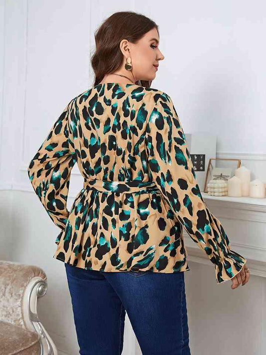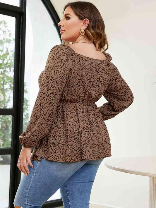 Plus Size Leopard Square Neck Long Sleeve Blouse