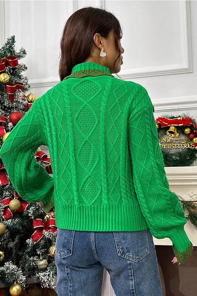 Cable-Knit Ruffled Mock Neck Lantern Sleeve Sweater